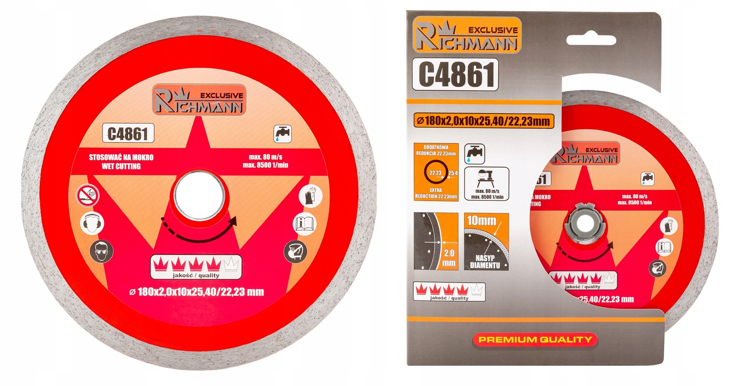 Щит має діаметр 180 мм, товщину 2,0 мм і отвір 25,4 мм, який можна зменшити до 22 .23 ммзавдяки включеному зменшенню. Крок алмазу по поверхні становить 10 мм, що гарантує ефективне різання без шкоди для якості обробки.
