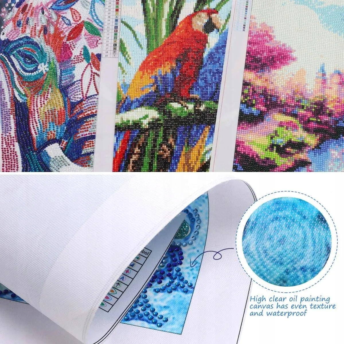 Цілкова новинка, яка стає дуже популярною в усьому світі. Набір виготовляється з полотна, яке покривається різними знаками та символами, а потім ми наносимо на нього певний колір діамантів. Дошку покривають спеціальним клеєм, який буде тримати елементи. Захисна плівка повинна бути покрита тільки в тому місці, де ми працюємо, щоб клей не втратив своїх властивостей.