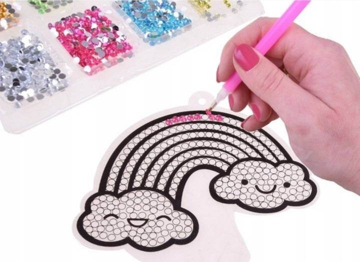 3️⃣ Візьміть аплікатор і занурте його. його кінчик у віск. b> Наклейте кристал на кінчик аплікатора, покритий клеєм, а потім перенесіть його на вибраний малюнок, намагаючись підібрати кольори кристалів до візерунок.