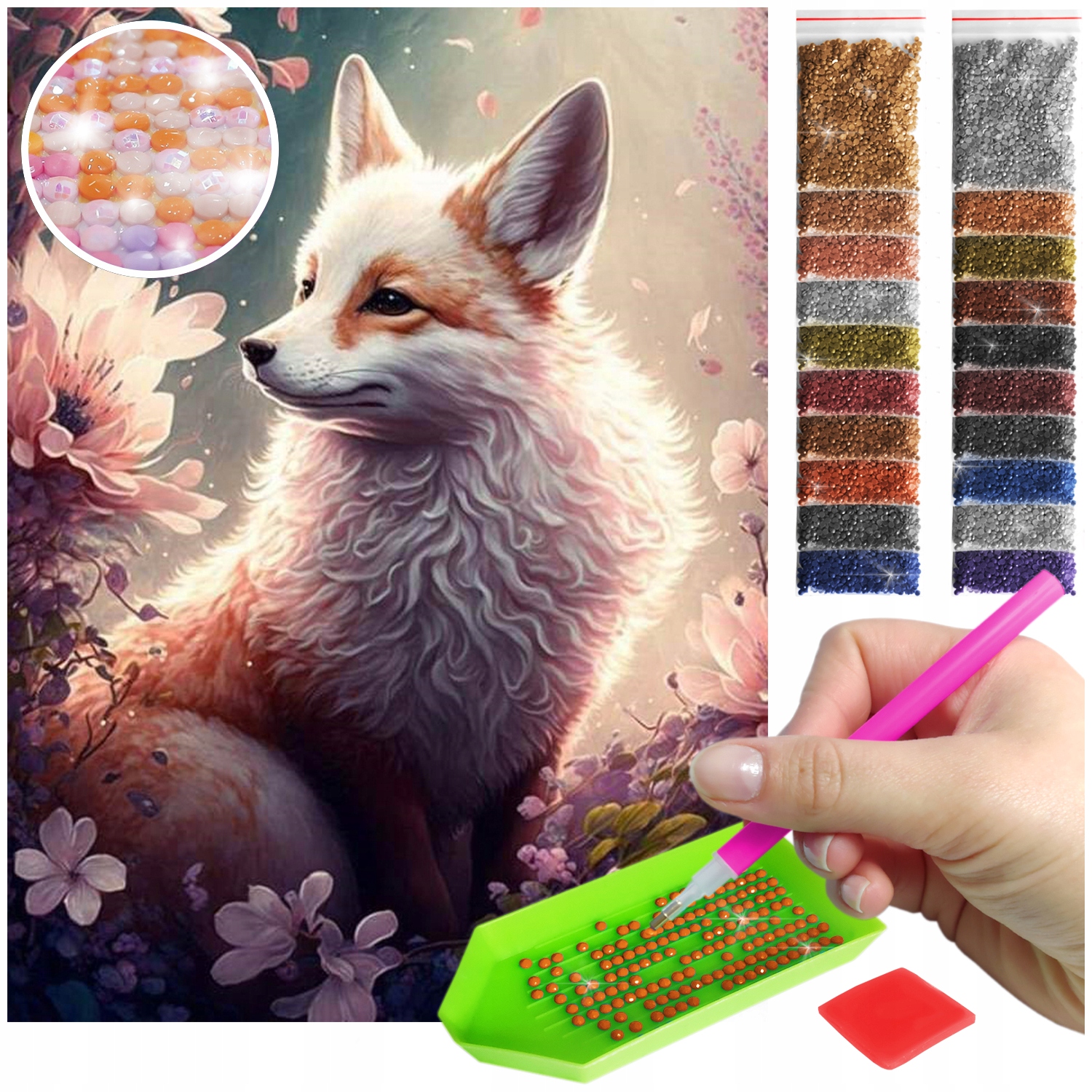 Діаманти - їх майже 15 тисяч. У кольорах, що відповідають обраному малюнку. Кожен відтінок упакований в окремий пакетик і позначений цифрами, щоб компонування було простим і приємним. Набір містить приблизно на 20 відсотків більше кристалів, ніж насправді потрібно. На всякий випадок, якщо ви втратите кілька штук :)