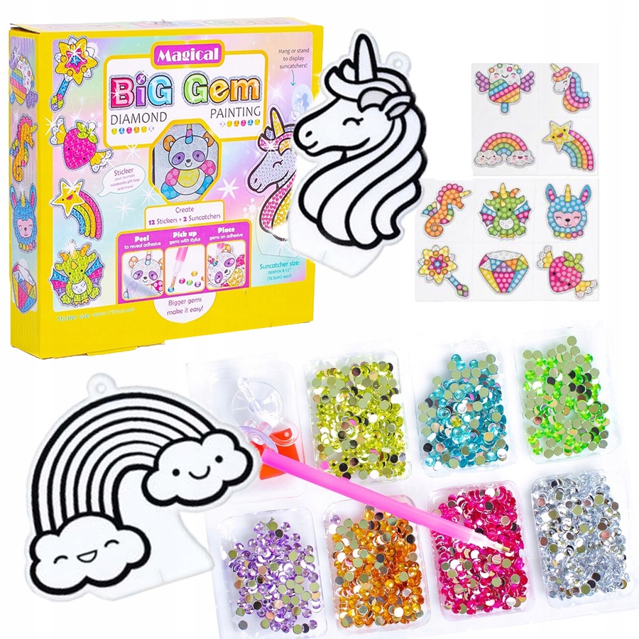 Остання колекція із серії Diamond Painting для дітей включає великі блискучі діаманти, які дозволять кожній дитині створити неймовірно барвисту роботу. Розташувати ромби можна на двох шаблонах, які можна повісити на вікно або поставити в кімнаті, на полиці, а також на 12 шаблонах наклейок, якими згодом можна прикрасити предмет одягу, чохол для телефону чи щоденник.
