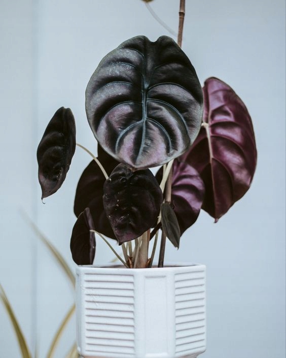 Alocasia в цьому сорті є надзвичайно оригінальним екземпляром для колекціонерів рослин. Листові пластини декоративні не тільки завдяки міцним жилкам. Листя темно-зелені, майже чорні. Для них характерний красивий металевий блиск. Що особливо вирізняє цей сорт алоказії, так це його фіолетово-фіолетове забарвлення.