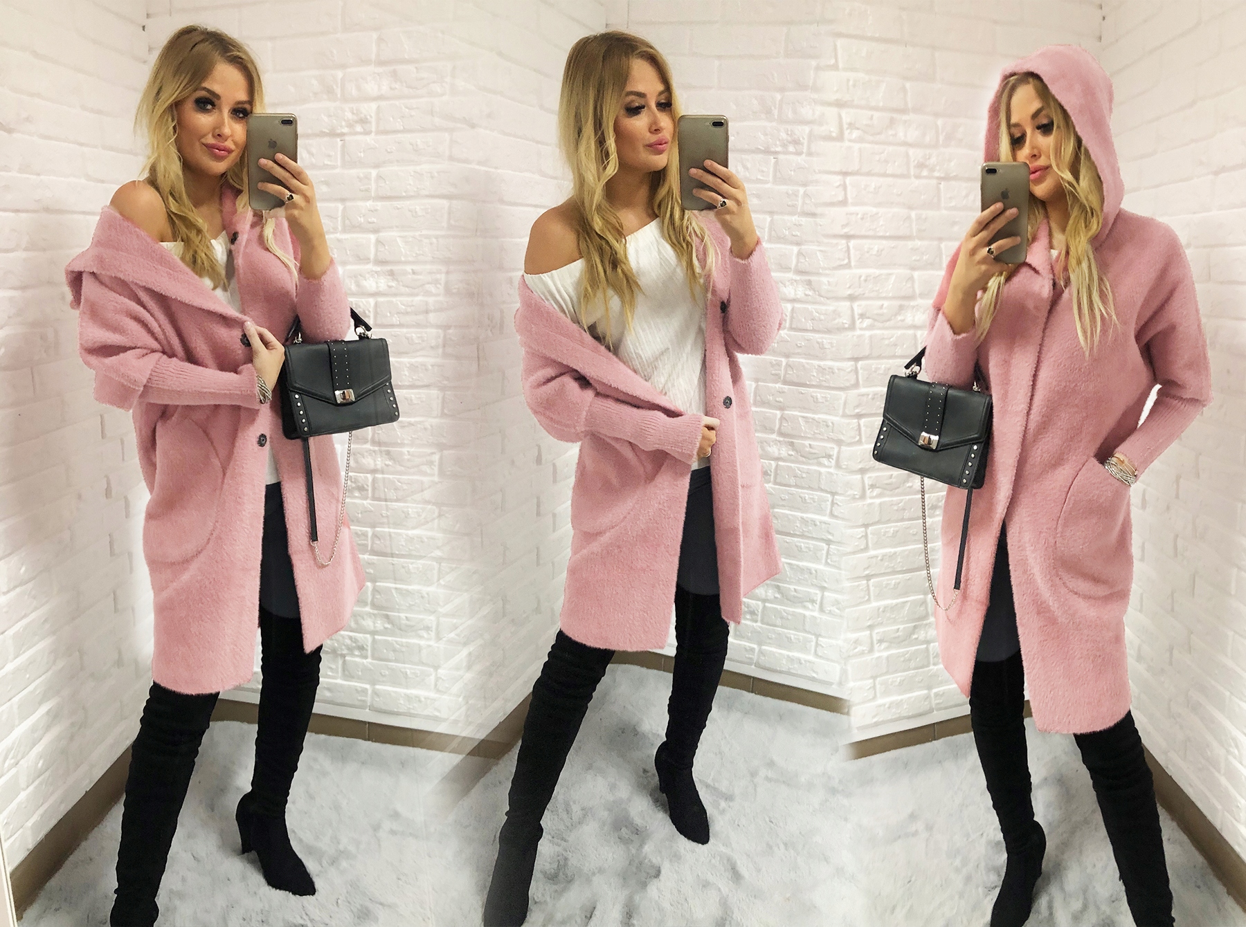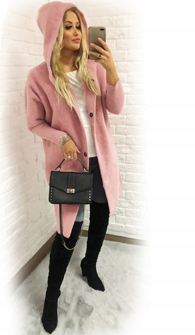 високі види з вовняною альпкою, дуже ніжною і м'якою на дотик. Пальто з капюшоном з великим розрізом ідеально адаптується до моделі силуету