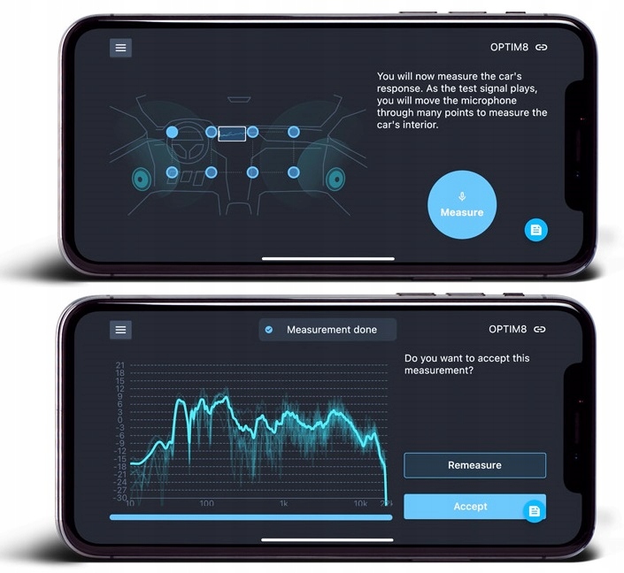 Вся звукова система менше ніж за п’ять хвилин завдяки інноваційним можливостям автоматичного настройки Alpine Optim8. Alpine Optim8 усуває всі складності, пов’язані з налаштуванням звукової системи, забезпечуючи простий, незалежний процес за допомогою додатка Optim на iPhone (iPhone/iPad) або програмному забезпеченні ПК із набором зовнішнього мікрофона KTX-CSP1 (продається окремо) для швидкого та точно виміряння внутрішнього транспортного засобу. Alpine Auto-EQ, що працює від фільтрів Eilex Prism ™ та VIR, спрощує процес налаштування звуку. Надає інструкції на екрані, завдяки яким користувач може легко зробити точне вимірювання системи автомобіля. Після вимірювання графічного інтерфейсу налаштування програмного забезпечення для ПК або додатка оптиму на iPhone забезпечує результати в реальному часі, завдяки якому користувачі можуть швидко та інтуїтивно покращити звук своєї системи. Під час вимірювального процесу користувач переміщує необов'язково доступний мікрофон KTX-CSP1 (або iPhone) по всій кабіні автомобіля, реєструючи сотні вимірювальних точок. Процес Auto-EQ є досить розумним, щоб ігнорувати виступаючу інформацію. Результатом є цілісний і дуже об'єктивний аналіз автомобільної системи кожного разу.