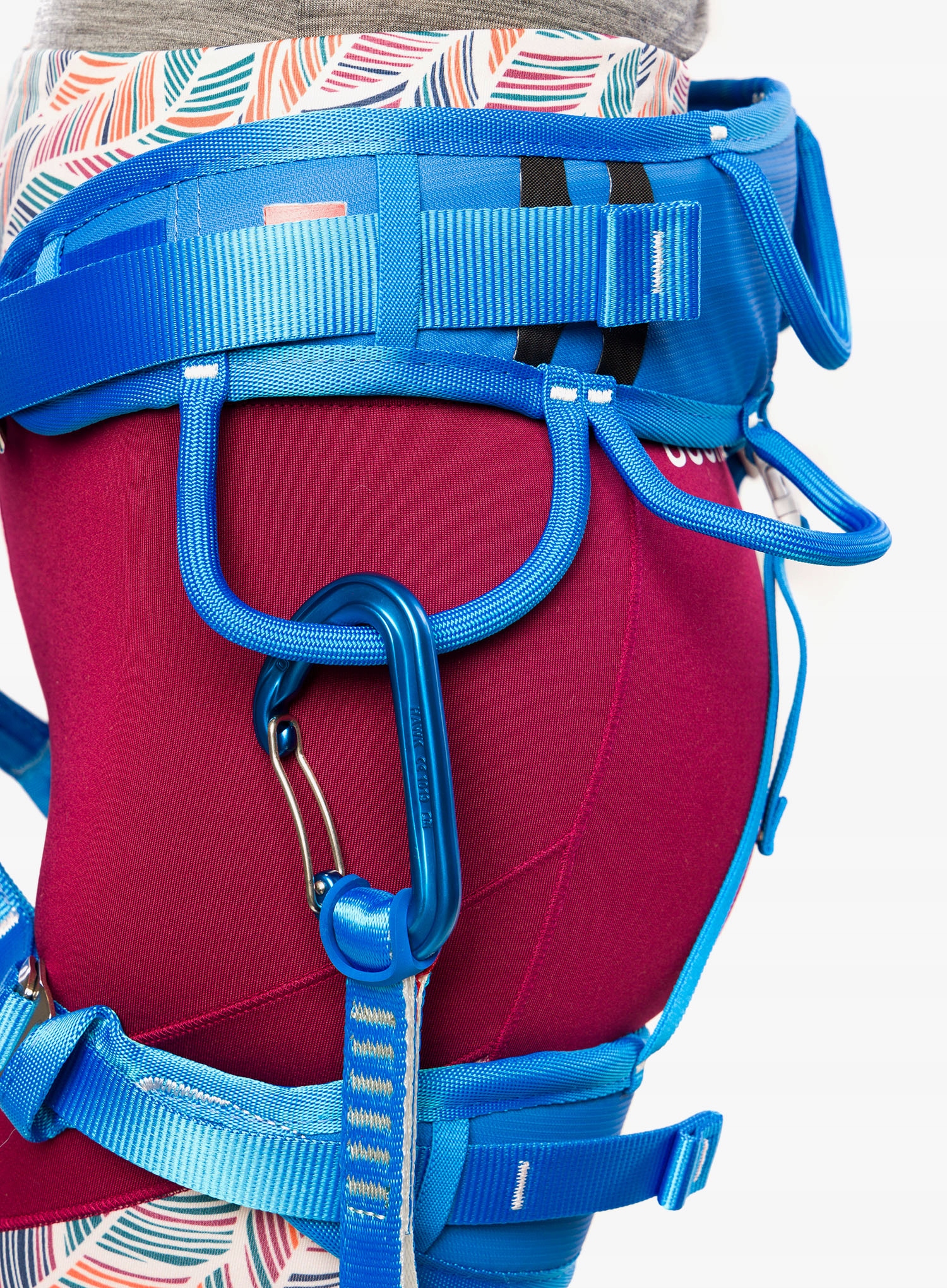 Петлі для ніг дозволяють вам вільно рухатися, не обмежуючи діапазон рухів. «Y»-подібний профіль допомагає рівномірно розподілити зусилля під час лазіння. Пряжки швидкого застібання дозволяють легко надягати і швидко знімати модель. Розсувний ремінь дозволяє розмістити його в правильному положенні. Ремінь для перенесення вільно проходить через тунель на стегновому ремені, завдяки чому центральна точка та шви завжди будуть правильно розташовані.