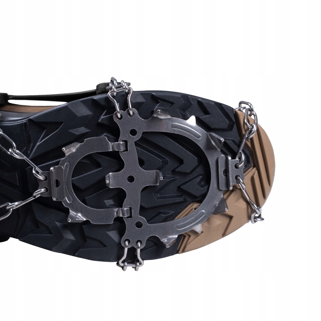 Зчеплення забезпечується 12 гострими зубцями з нержавіючої сталі, з’єднаними міцним ланцюгом. Така конструкція ефективно запобігає ковзанню на слизькій поверхні, підвищуючи комфорт і безпеку походу. Все це доповнюється практичним чохлом, оснащеним карабіном і ручкою, який захищає решту спорядження в рюкзаку від пошкодження шипами та полегшує транспортування та зберігання ручок.