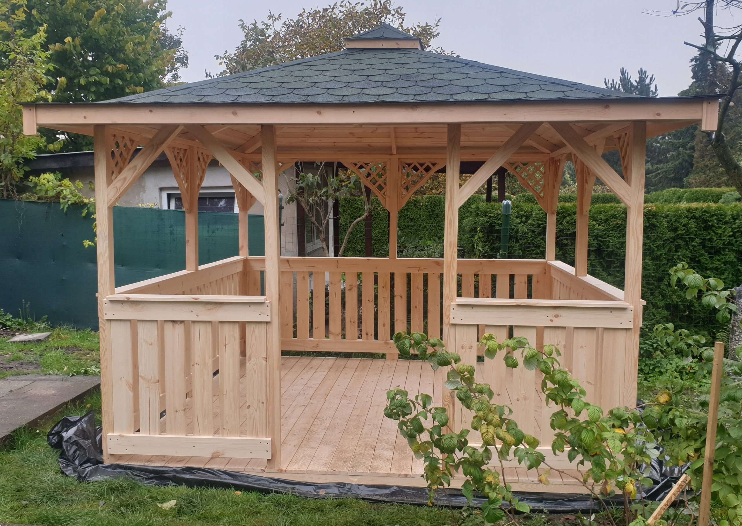 Альтанка виготовлена з висушеної непросоченої деревини. Щоб забезпечити більший термін служби деревини, альтанку слід пофарбувати просоченням або маслом відразу після складання.