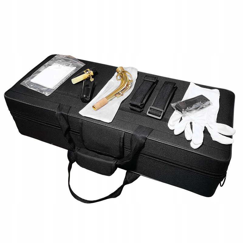 в набір з саксофоном як 100 є спеціальний суцільний випадок з кишені для нотаток та невеликих аксесуарів, які ми можемо носити в руці або на плечі. Сумка утворюється і повністю жорсткий. Всередині є порожниста, ідеально підходить до форми інструменту , завдяки якому саксофон не рухається всередину, а також додаткові відсіки для аксесуарів.