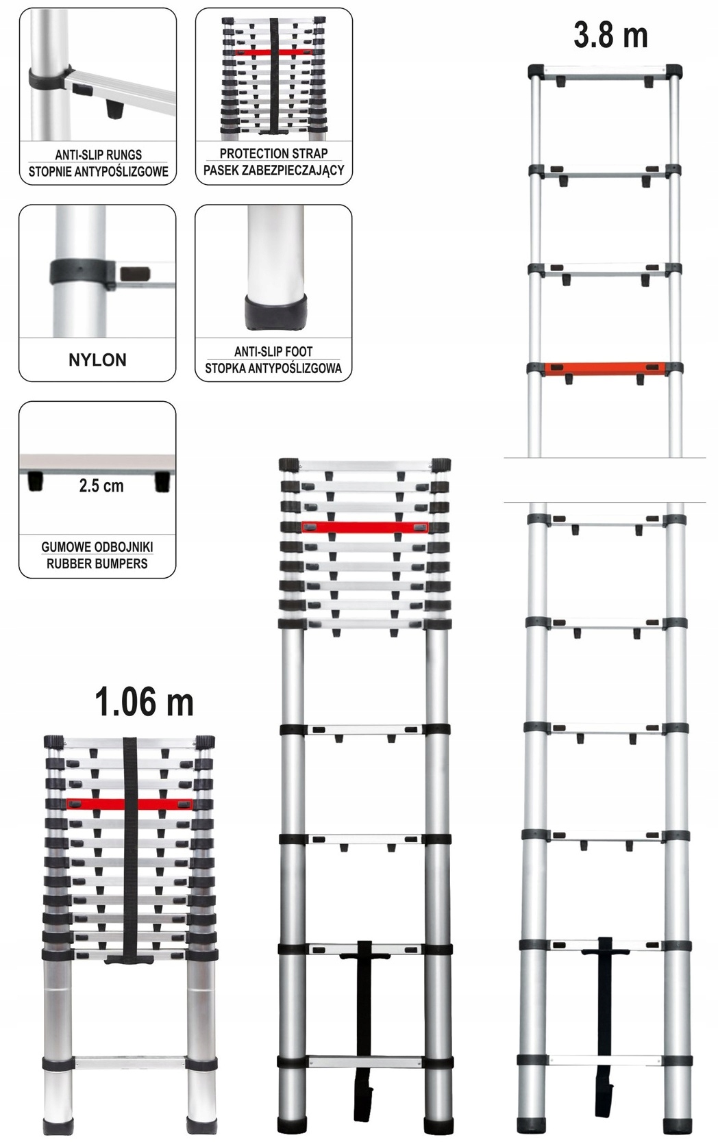 Алюмінієва телескопічна драбина корисна під час роботи в домашніх умовах, саду, складі, майстерні та будівництві. Рівні не -SSLIP обмежують ризик падіння