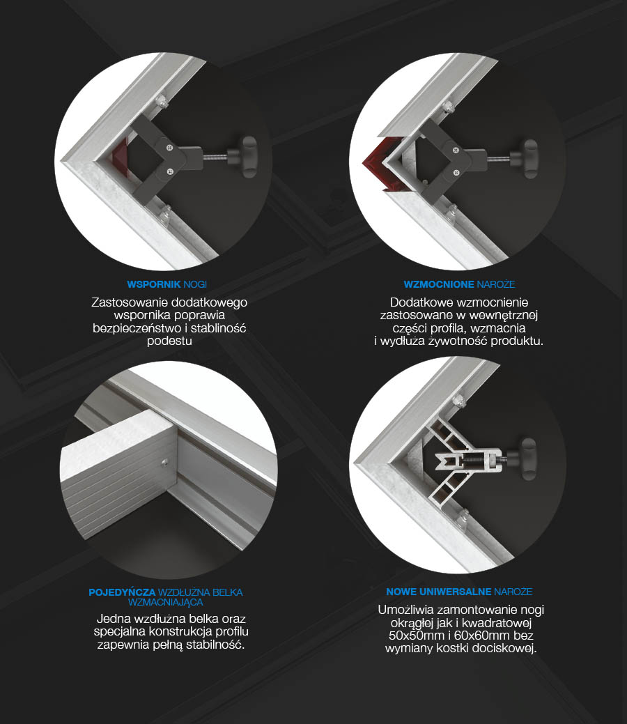 Платформи побудовані на основі легкого, спеціально розробленого алюмінію профіль, за допомогою якого ми з’єднуємо платформи в потрібну нам форму. На профіль кріпимо всю фурнітуру: самовирівнювальні куби, ручки для перил, ручки для сходів і монтажні куби, на які можна повісити маскувальні штори або рекламні банери.