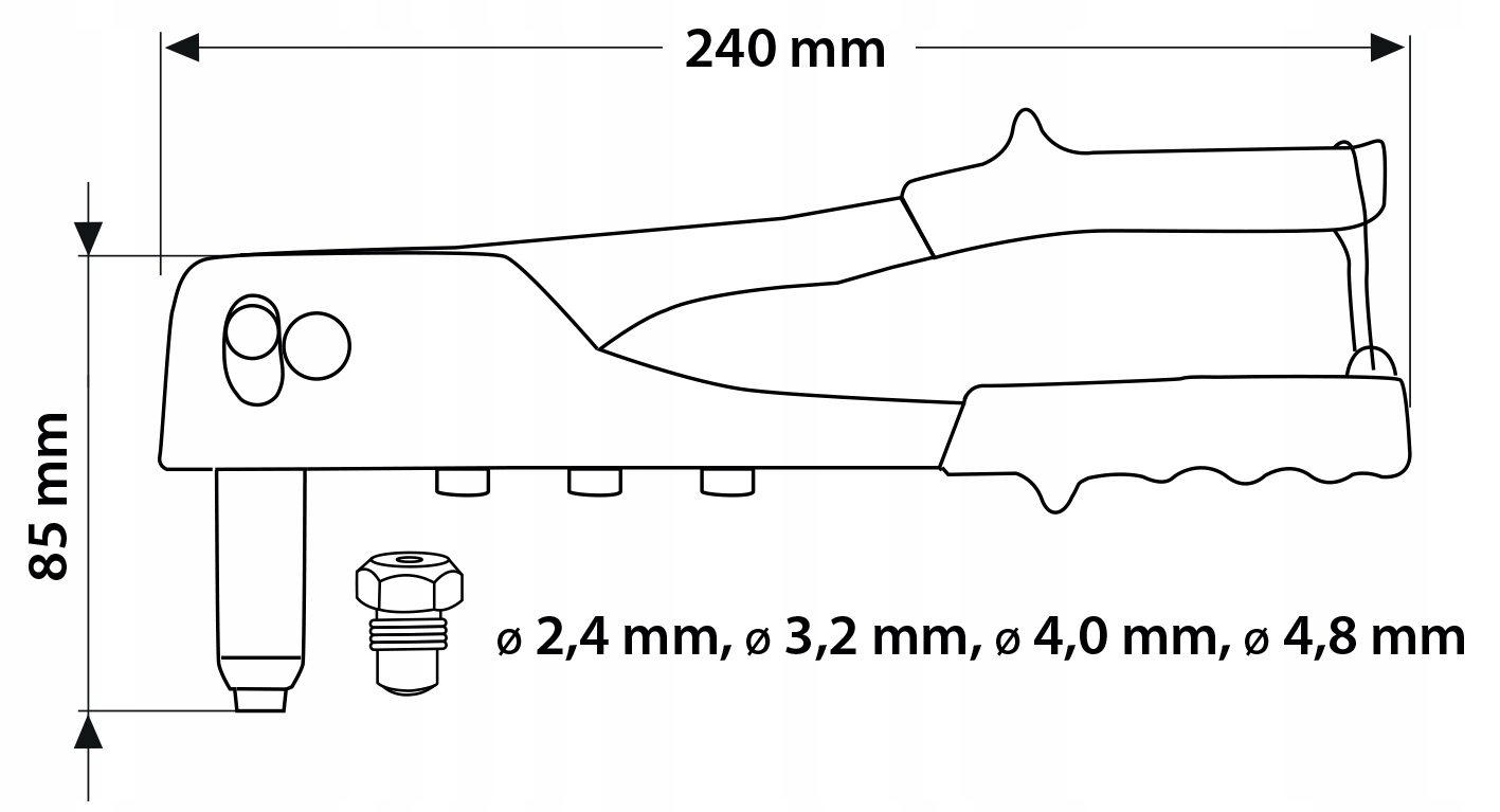 - Розмір заклепальника [Д x В] 240 x 85 мм