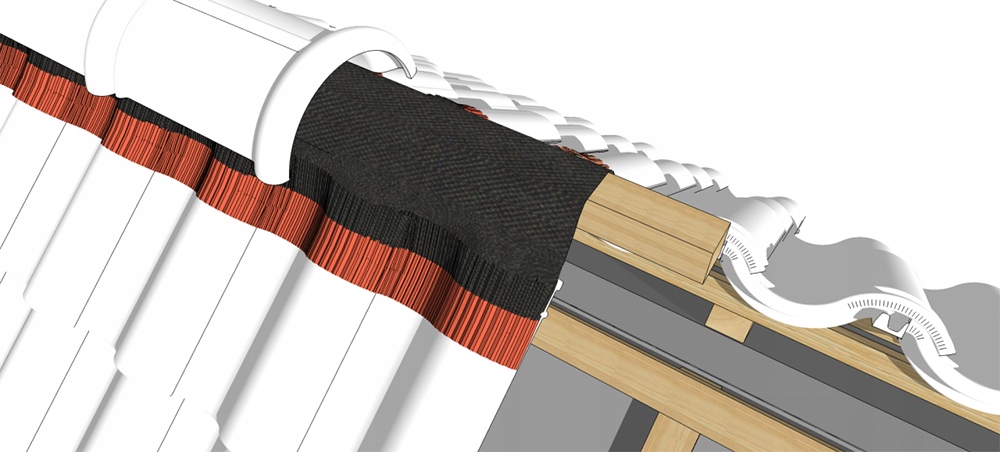Ридж -стрічка завдяки парі -проникному геотекстилі ефективно провітрює хребет та кут даху. Стрічка ідеально передає повітря та вологу, захищаючи від проникнення під покрівельним покрівлям, дощовою водою та снігом. Висока стійкість до погодних умов та ультрафіолетового випромінювання спричиняють тривалий термін. Стрічка характеризується надзвичайно міцним кріпленням алюмінієвого геотекстилю, його висока гнучкість забезпечує легку збірку. Алюміній з плісировкою робить його дуже простим у встановленні на різних типах покрівлі.