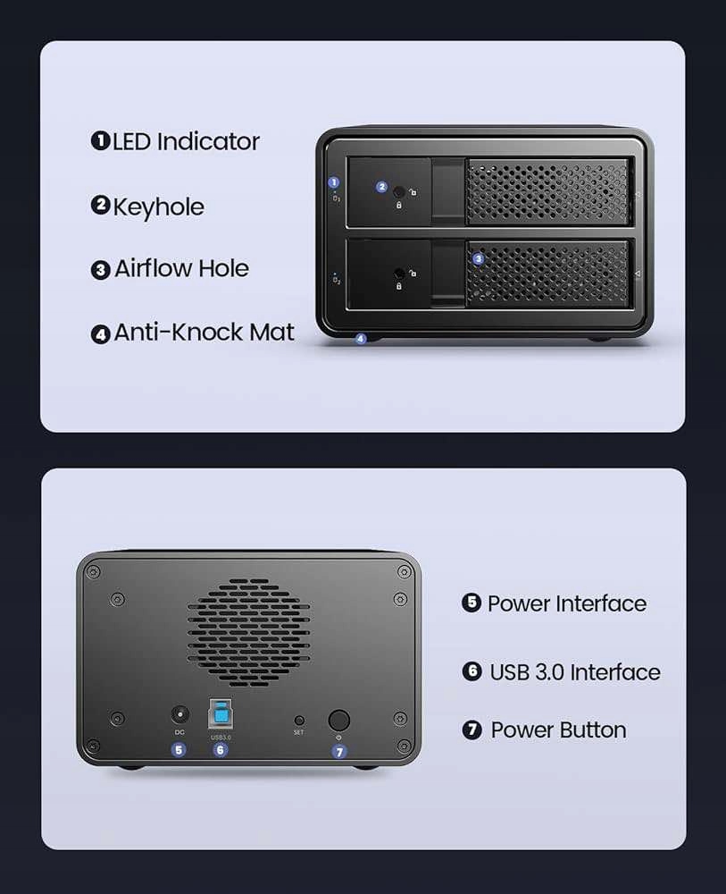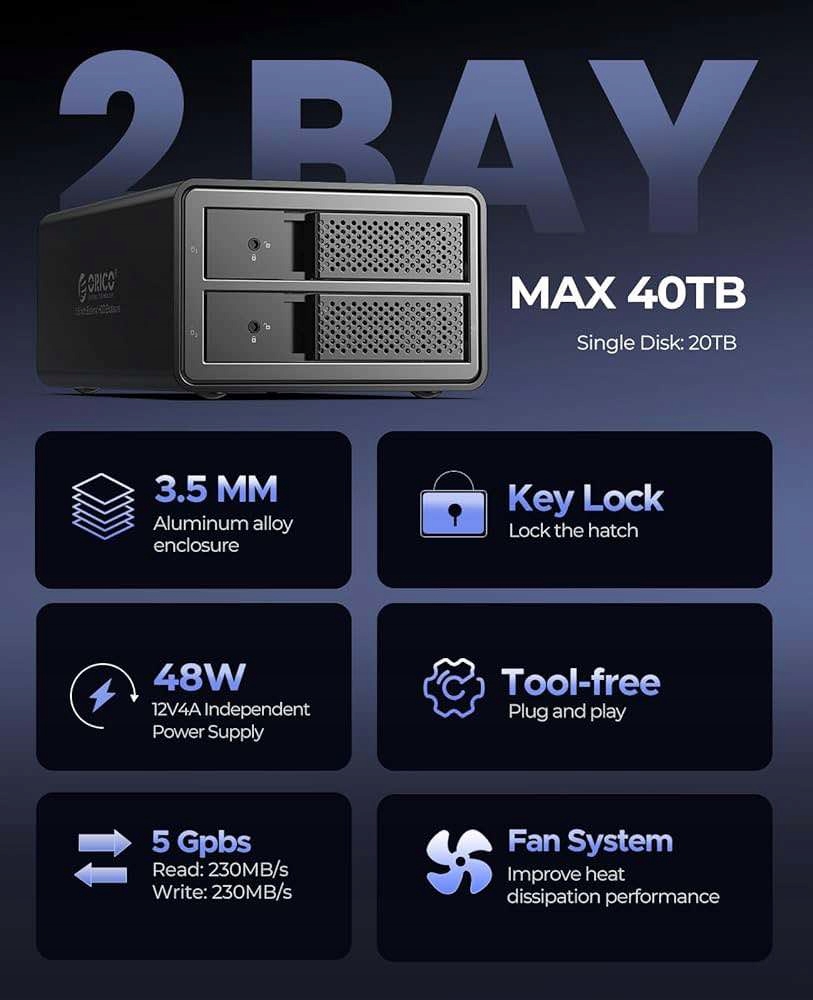 - 【Збільшення ємності до 40 ТБ】2 корпус зовнішнього жорсткого диска, сумісний 3,5-дюймовий жорсткий диск SATA, підтримує жорсткі диски до 20 ТБ, загальна ємність до 40 ТБ. 3,5-дюймовий корпус для жорсткого диска має швидкість передавання до 230 МБ/с і може швидко передавати файли.