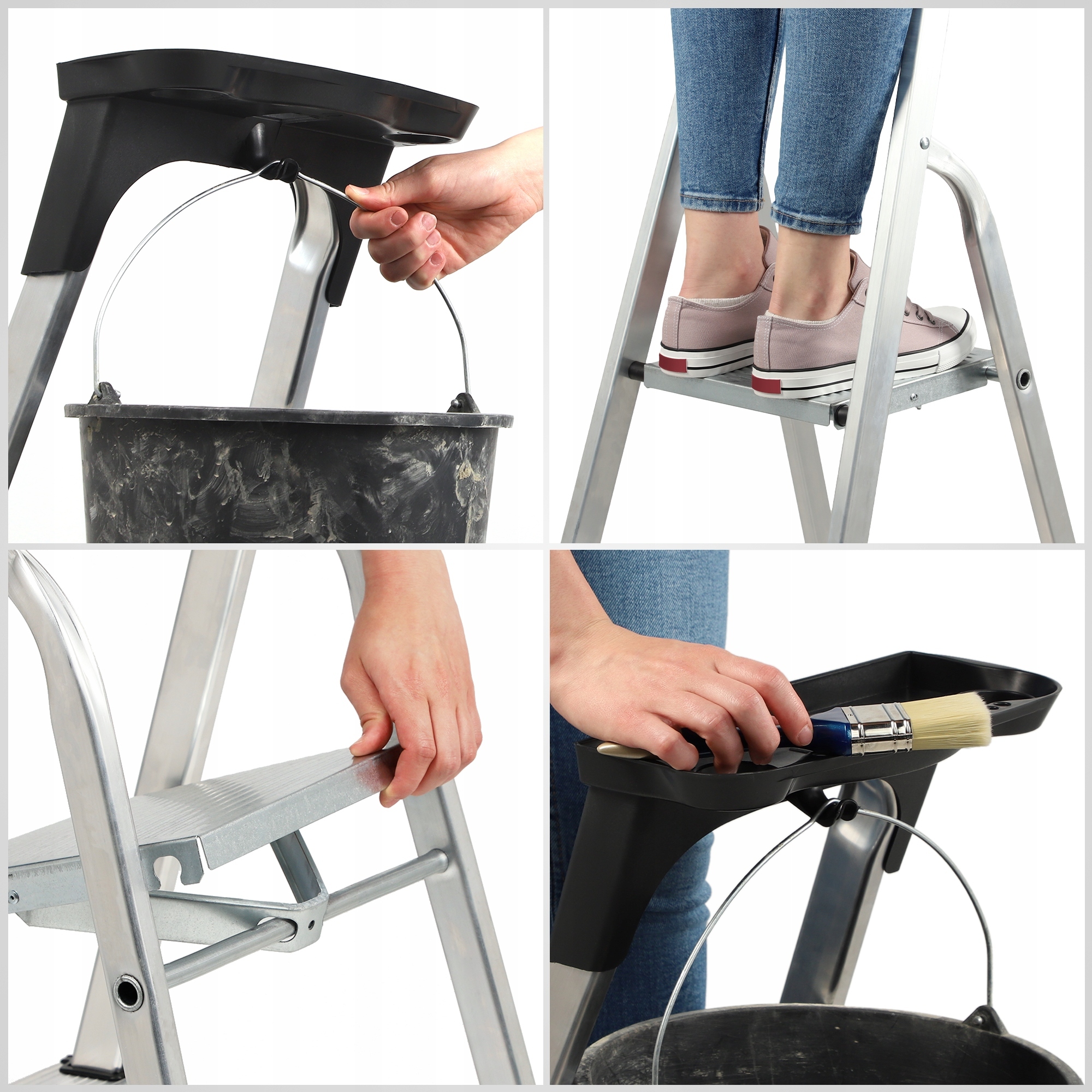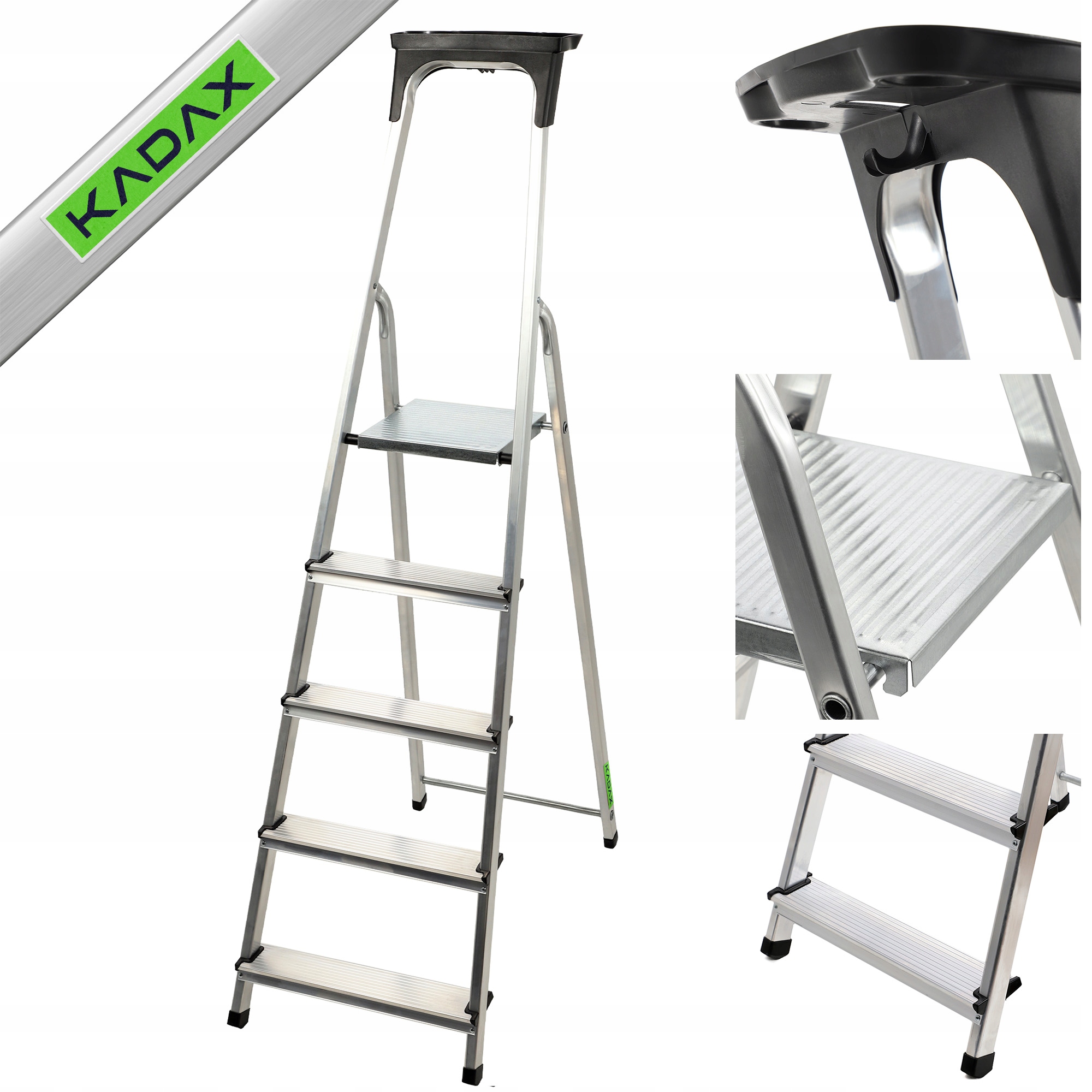 ДОМАШНЯ АЛЮМІНІЄВА ДРАБИНА 5 КРІШКІВ 125 кг СКЛАДНА ПОЛИЦЯ + ГАЧОК