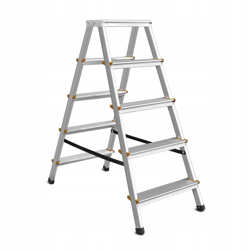 Окремо стояча алюмінієва драбина з двостороннім входом. Ідеально підходить для дому та ремонту. Оснащений протиковзкими ніжками.