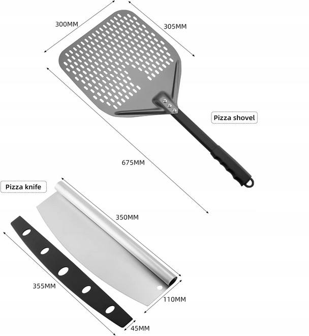 Набір для піци ідеально підходить для домашньої піци. У комплект поставки входить слайдер для піци (30,5 х 35,6 см і знімна ручка 35,6 см), різак для піци 35,6 х 10,2 см з нержавіючої сталі та різак для піци Deluxe з нержавіючої сталі. Усі інструменти для домашньої піци