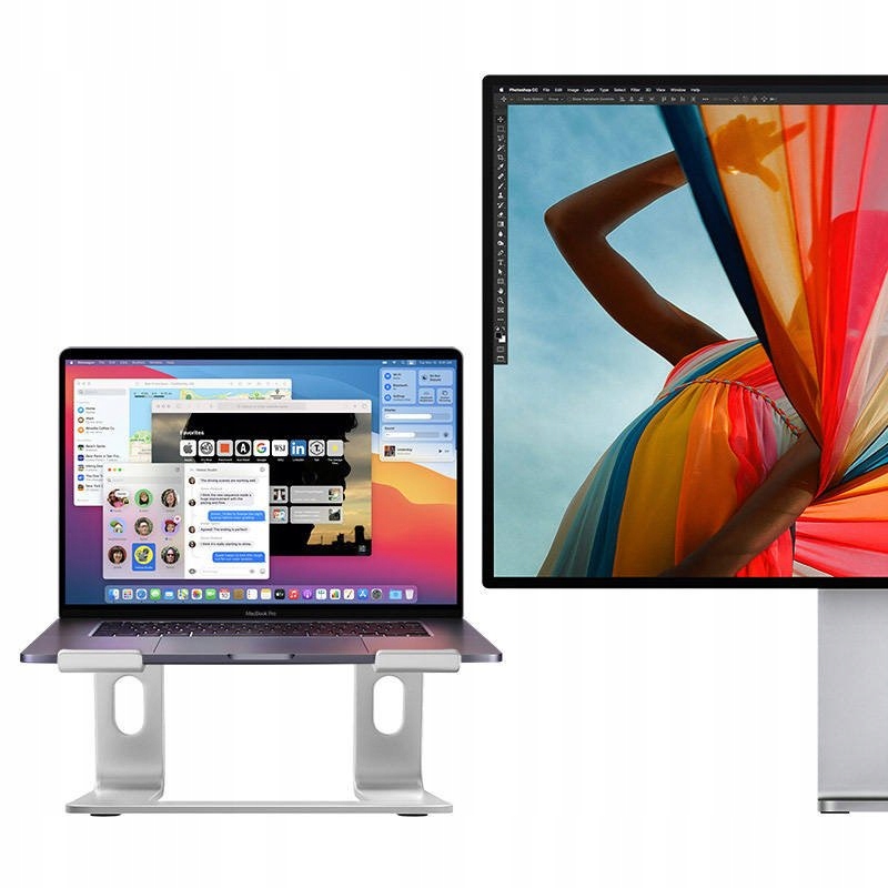 Підставка AluBench — ідеальне рішення для роботи з ноутбуком і додатковим зовнішнім монітором. Розміщення ноутбука на висоті другого монітора дозволяє зручно працювати з кількома програмами одночасно. Більш пряма постава та менша напруга в шиї сприяють підвищенню продуктивності та комфорту роботи за столом. Оскільки ноутбук розташований на піднятій поверхні, тепло, яке він генерує, може виходити в будь-якому напрямку і, як наслідок, не навантажує систему охолодження.