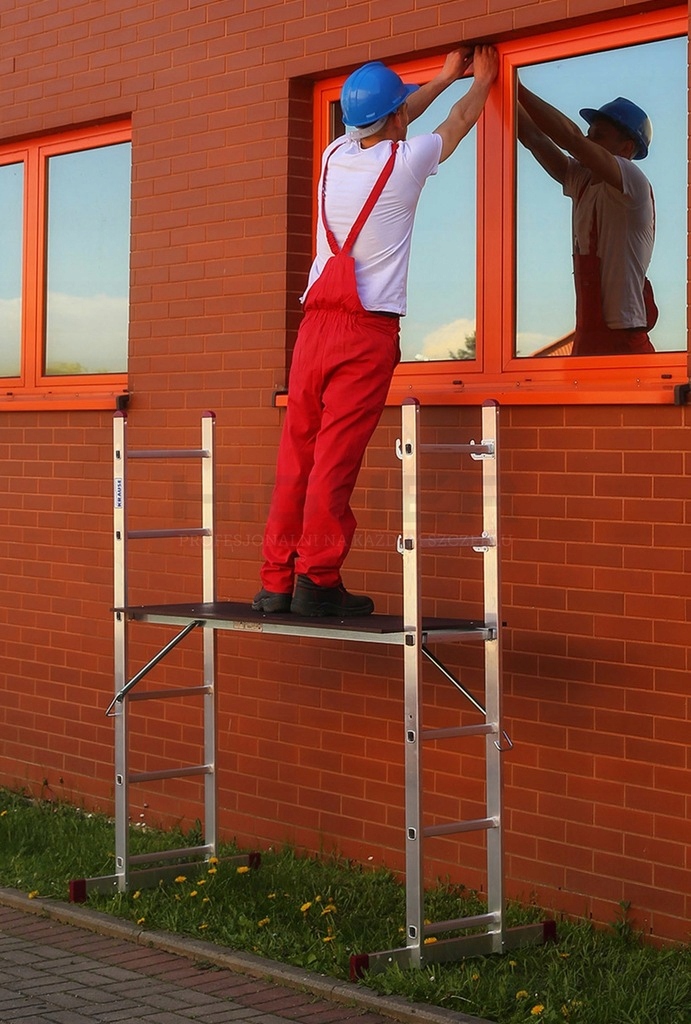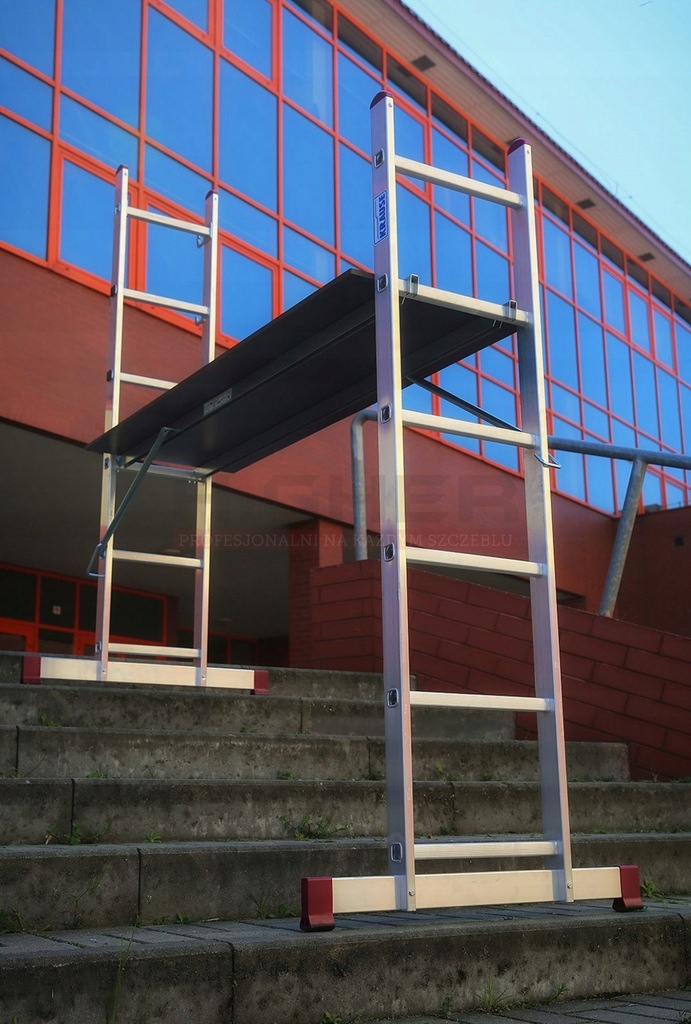 Завдяки великим розмірам робочої платформи: довжина - ширина 1,47 м х - 0,50 м. Платформа зручна для використання та дозволяє комфортно працювати. Допустиме навантаження платформи та сходи становить 150 кг. Запропонований продукт включає: 2 6 рівня сходи та платформа, виготовлена з водонепроникних фанери.
