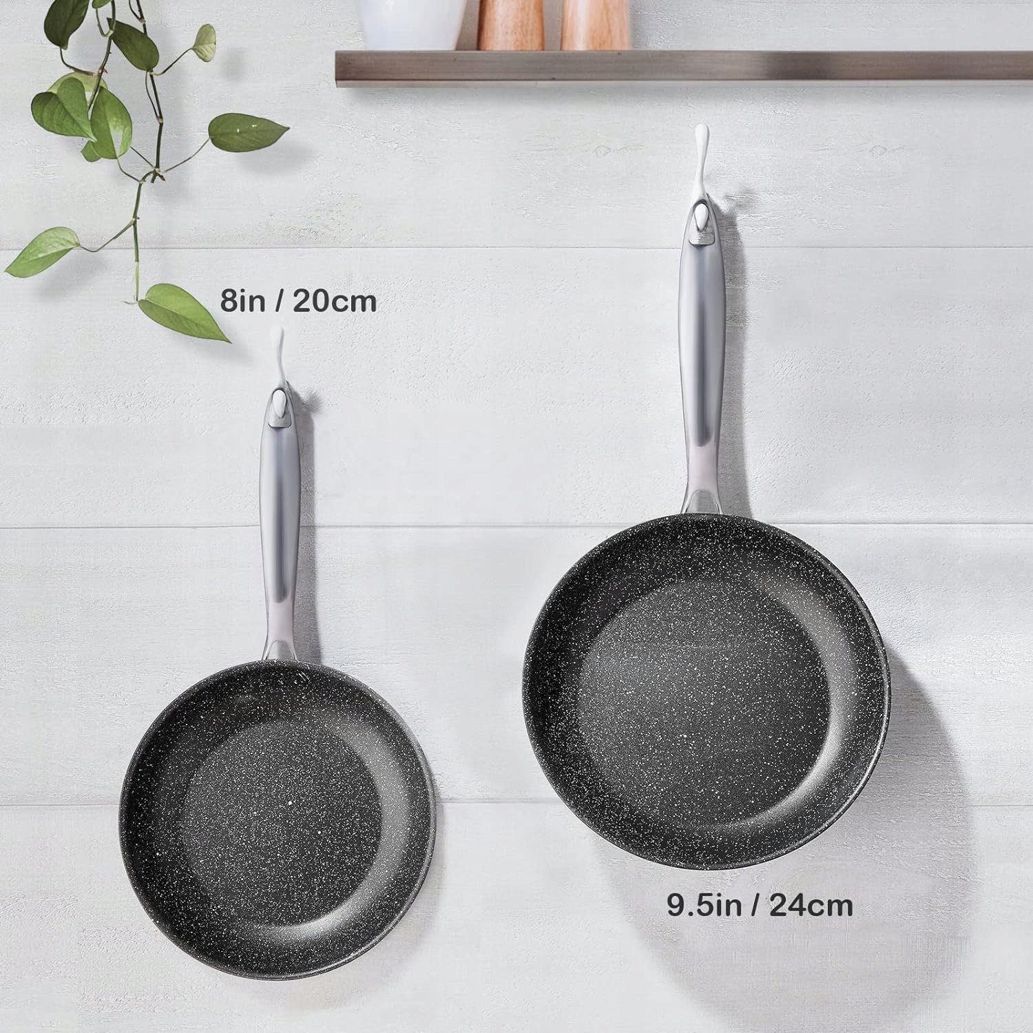 Здоровий матеріал, гарантія безпеки: Двоє -частинна каструля діаметром 20 см і 24 см відповідає щоденним потребам приготування їжі і не містить PTFE/APEO/PFOA, що може негативно впливати на здоров'я. 5-шарові покриття включають внутрішнє антипригарне покриття, посилений шар, стійкий до подряпин та споживання, армований алюмінієвий сплав, покращений нижній шар та зовнішній антипригарний шар.