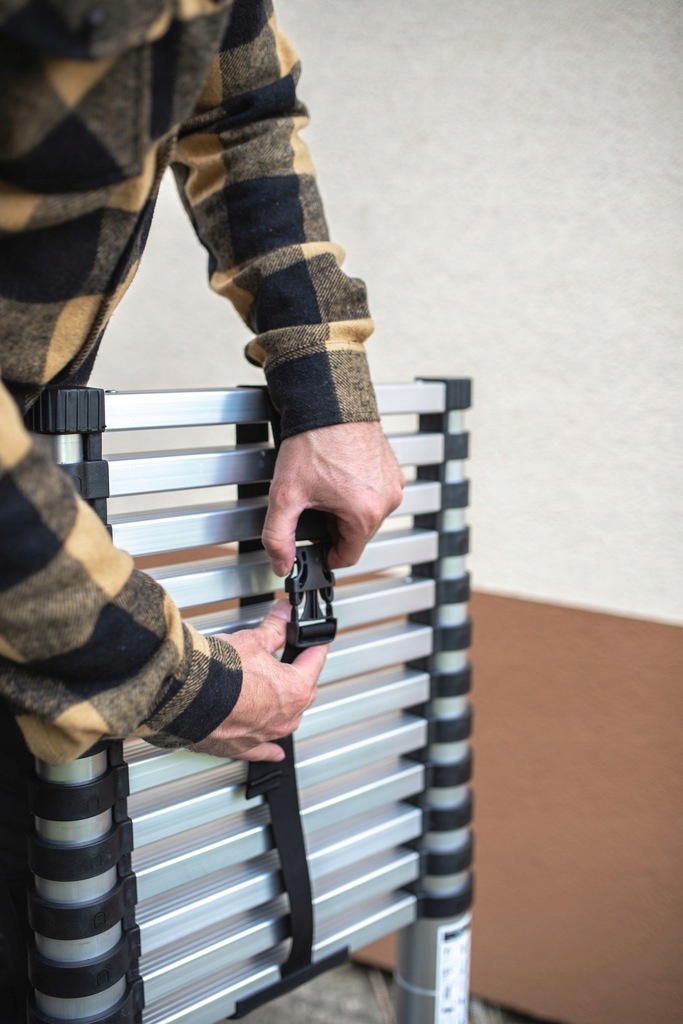 З ручкою для зручного перенесення та ременем безпеки, який захищає від розсуванняd під час транспортування, використання драбини стає ще комфортнішим і безпечнішим. Драбина компактна та легка, оскільки важить лише: 6,5 кг.