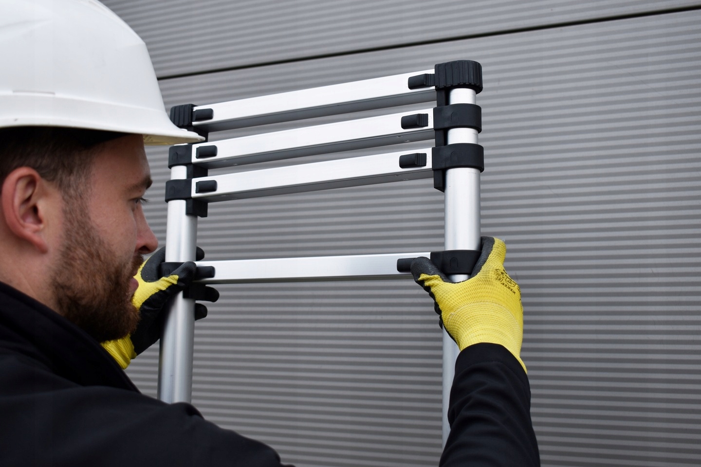 Завдяки цьому інноваційному механізму драбина автоматично блокується на вибраній висоті, усуваючи ризик випадкового складання або зміщення.
