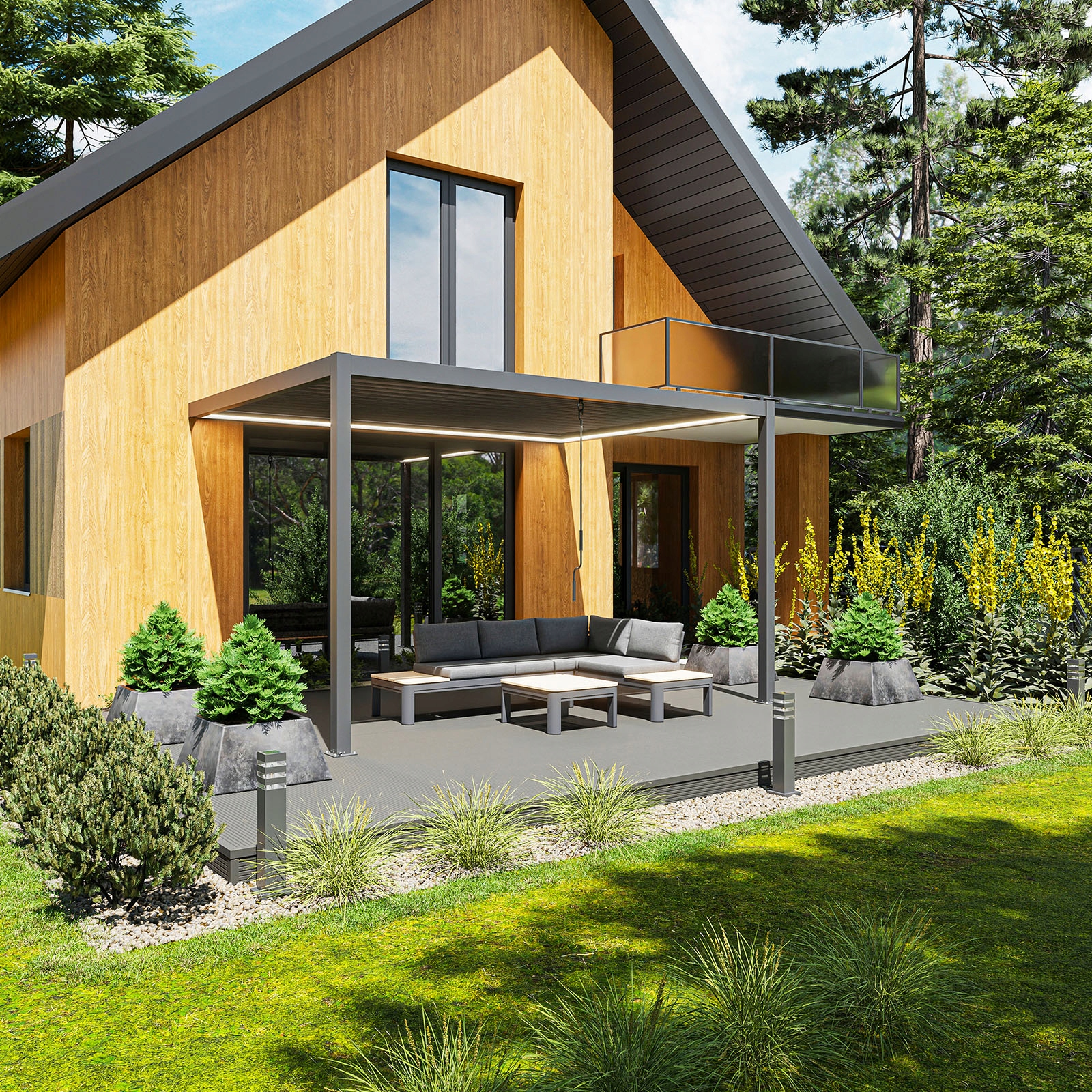 Мінімалістичний антрацитовий вигляд надає перголі елегантності та ідеально вписується в сучасний дизайн садів і терас. Увечері світлодіодне освітлення створює приємну, інтимну атмосферу, роблячи перголу центром рекреаційного простору.