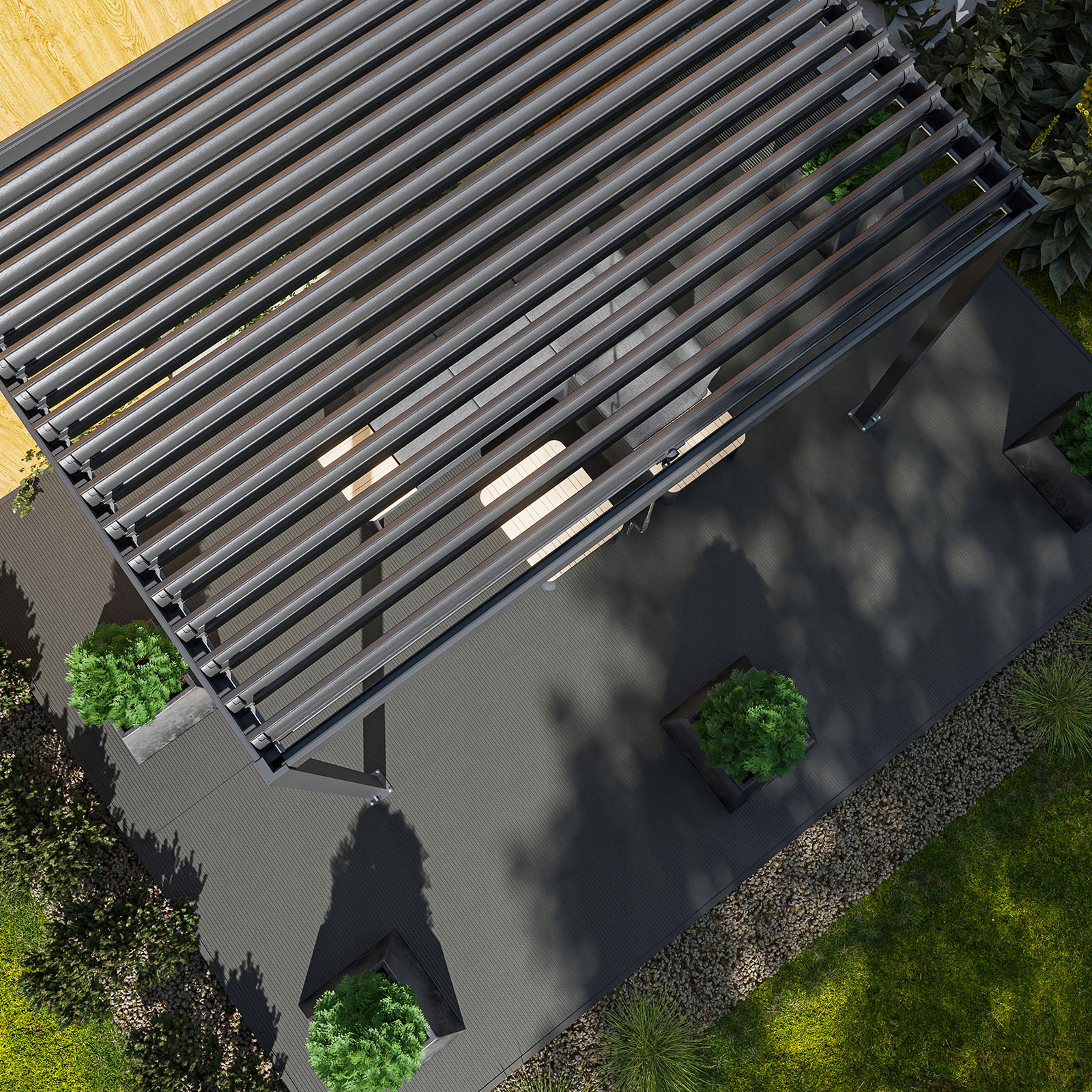 Завдяки модульній структурі також можна об’єднати кілька пергол, що дозволяє створити цілісні більші зони відпочинку.