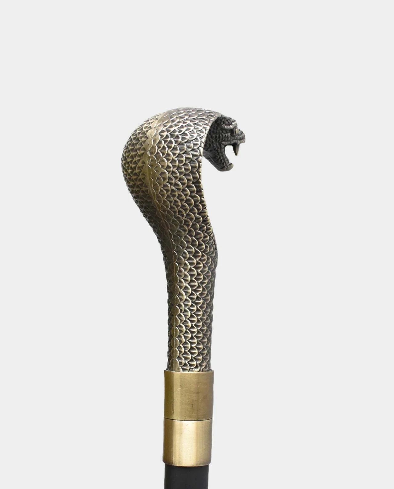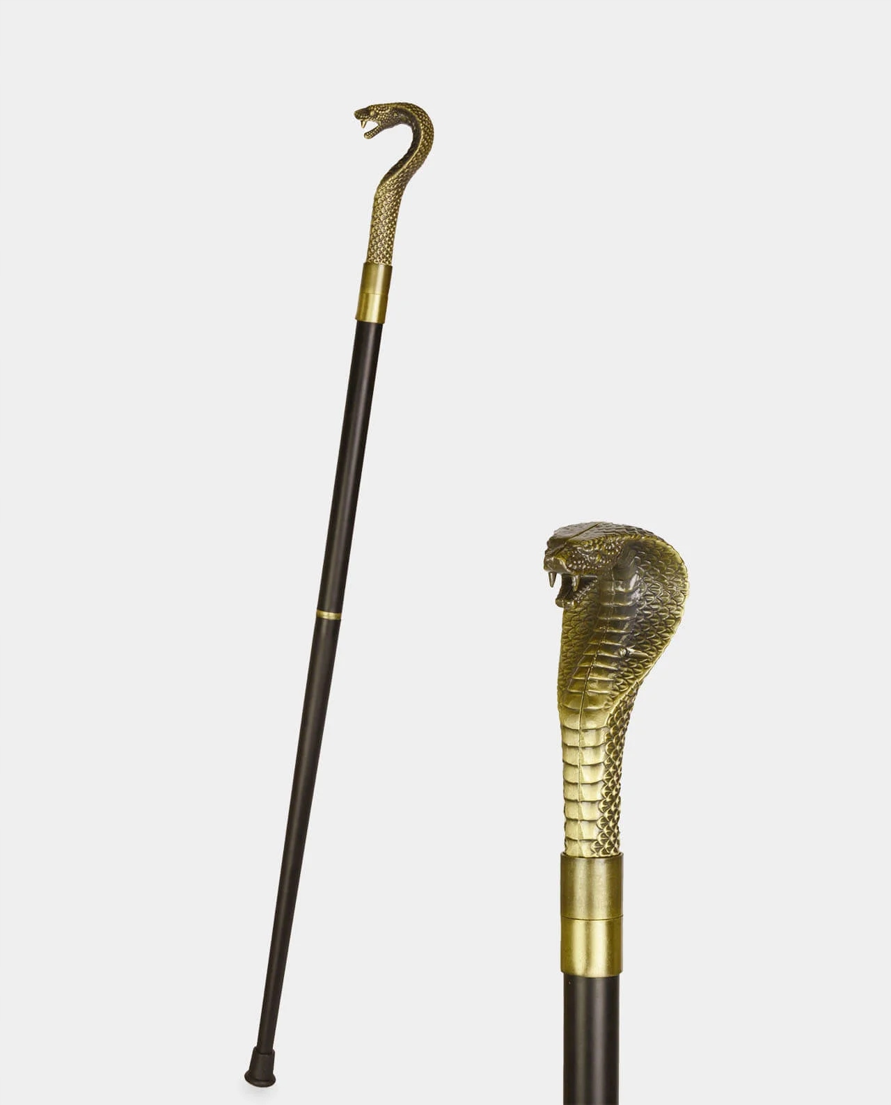 Палиця з ручкою у вигляді голови кобри. Ця гарна та оригінальна палиця повністю виготовлена з алюмінію. Стрижень палиці виготовлений з алюмінію, покритий лаком елегантного чорного кольору та оздоблений гумовою ніжкою. Ручка у формі декоративної скульптури виготовлена з алюмінію. Тростину можна відкрутити і скласти навпіл, що дуже зручно в подорожах.