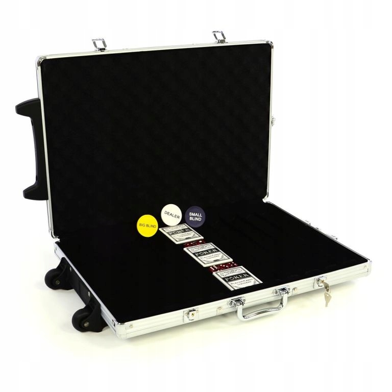 Сильна алюмінієва валіза на колесах з трьома блискавками та намальованою ручкою ідеально підходить до 1000 жетонів для покеру. Ви повинні купувати жетони, які ви можете вибрати індивідуально, решта Vybavení включена.