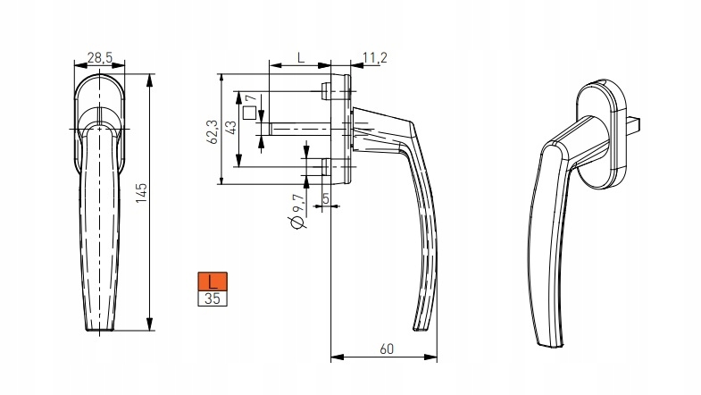 Алюмінієва віконна ручка, шпилька 35 мм, довговічна роками
