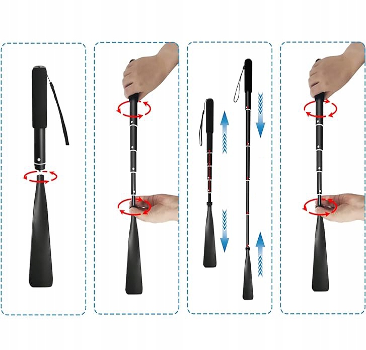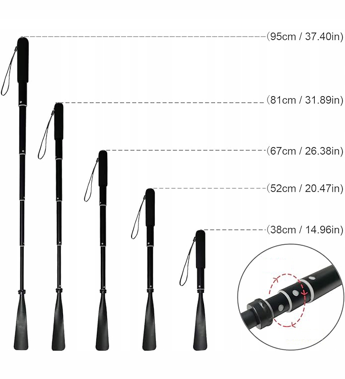 - 📏 Телескопічна конструкція дозволяє регулювати довжину 36,8 см до 94 см, що дозволяє зручно розміщувати взуття як у сидячому, так і в положенні стоячи. Ідеально підходить для людей похилого віку, вагітних, дітей та людей з обмеженою мобільністю.