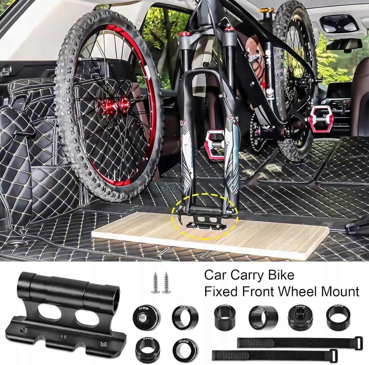 Алюмінієвий тримач велосипедної вилки з адаптерами та гвинтами ідеально підходить для транспортування велосипеда на даху автомобіля. Легка і міцна конструкція, забезпечує стабільну установку. Підходить для більшості швидкознімних і наскрізних вил.
