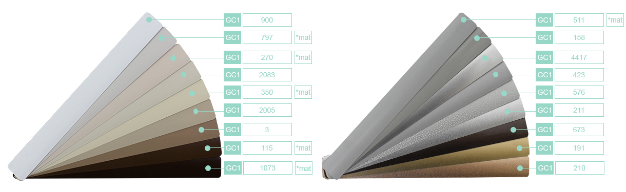 Алюмінієві жалюзі доступні в чотирьох розмірах: 16 мм, 25 мм, 35 мм і 50 мм. Кольори доступні в різних цінових групах (GC1 - найдешевший GC5 - найдорожчий).