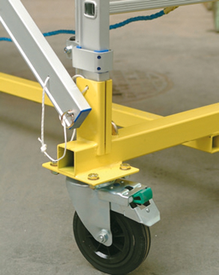 - Зручне переміщення риштувань завдяки використанню міцного сталевого візка, оснащеного ножними гальмами для повороту та обертові колеса.