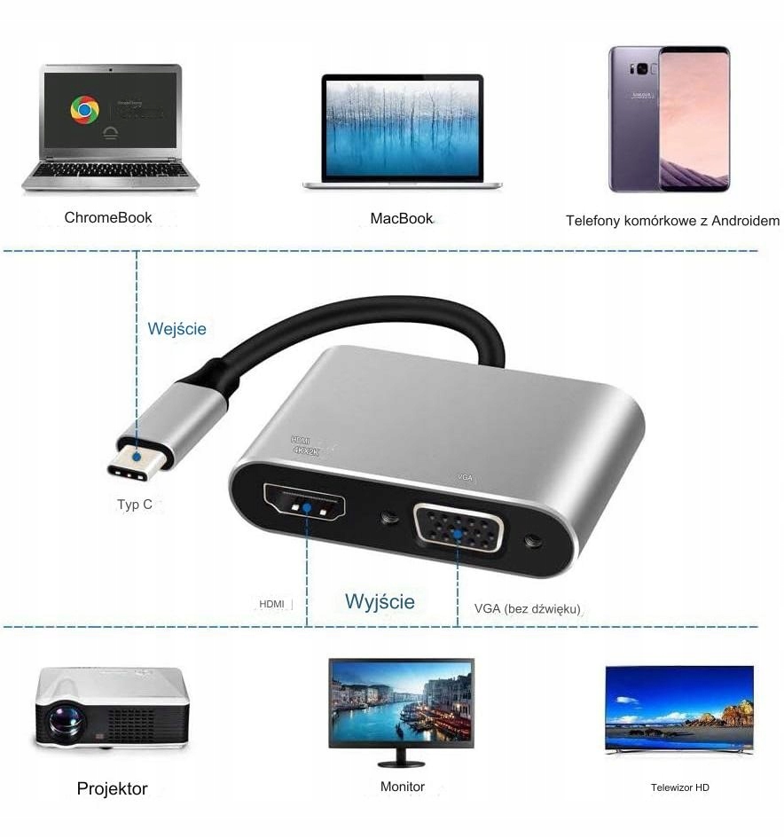 Адаптер універсальний, він працюватиме з багатьма системами, оснащеними входом USB Type-C, зокрема: Комп’ютери Chromebook, Macbook, смартфони з Android, які забезпечують швидку та плавну передачу зображення та звуку через порт HDMI у якості 4K/30 Гц і передачу зображення 1080p через порт VGA.