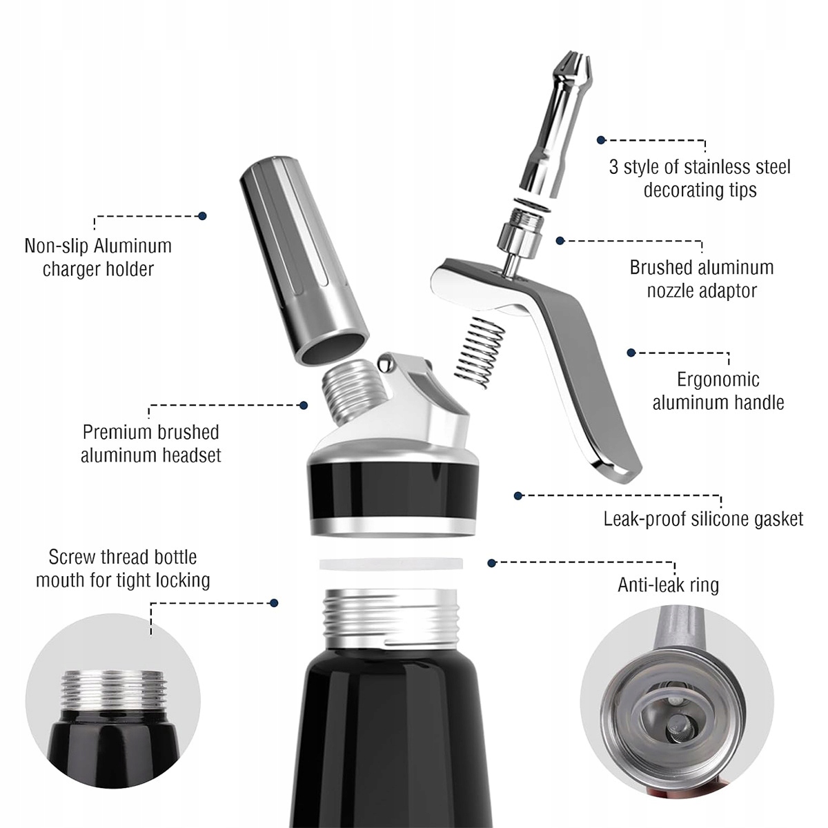 🎂 Гаряче та холодне: алюмінієва головка та корпус як а також наконечники з нержавіючої сталі роблять сифон придатним як для приготування холодних, так і для гарячих кремів.