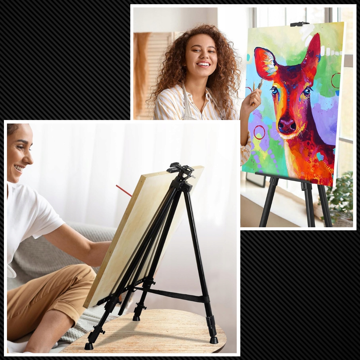 виставки та презентації: мольберт також може бути використаний як елегантний виставковий стенд під час виставок, презентацій та ярмарку мистецтва. Естетичний зовнішній вигляд та суцільний дизайн роблять його чудовим рішенням для представлення творів мистецтва в галереї, на виставці або під час приватних шоу.