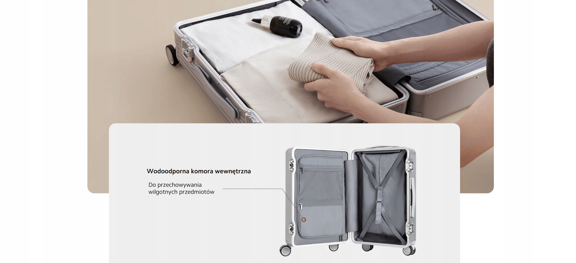 Внутрішня частина валізи оснащена кишенями, укладеними U та X -укладаними смужками, що забезпечує всебічне сховище. Водонепроникна камера дозволяє відокремити мокрі предмети та подбати про гігієну.