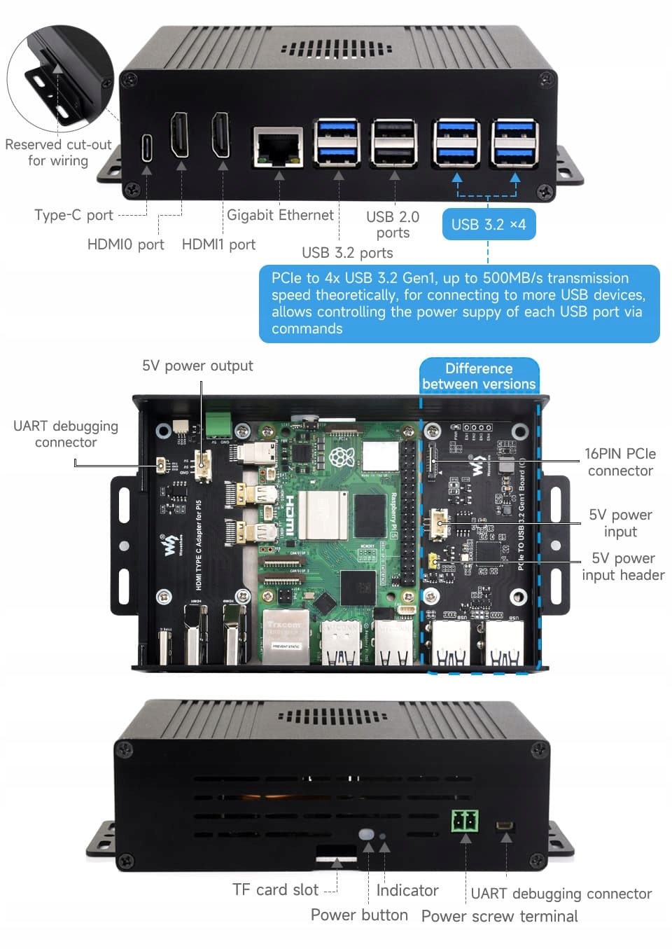Багатофункціональний мінікомп'ютер, встановлений з розширенням 4 x USB3.2 для Raspberry Pi 5, дозволяє додати чотири USB -порти з швидкістю до 5 ГБП завдяки системі VL805. Ідеальне рішення для підключення дисків, клавіатур, мишей або мережевих інтерфейсів, збільшує функціональність Raspberry Pi 5. Алюмінієвий корпус забезпечує захист, ефективне охолодження з вентиляційними отворами (і необов'язковим вентилятором) та полегшує встановлення додаткових модулів та функція контролю живлення USB покращує управління енергією.