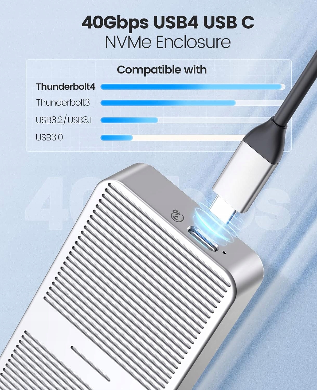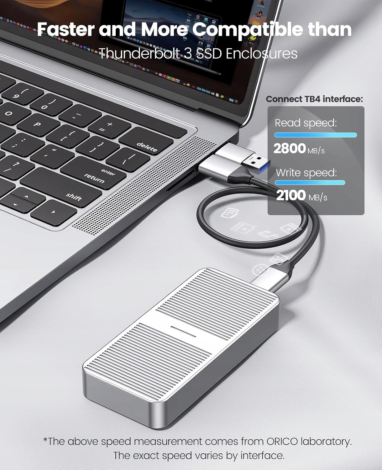 NVME корпус 40 Гбіт/ с підтримує швидкість передачі даних до 40 Гбіт/ с для стабільної та ефективної передачі. Випробувана лабораторією Orico, швидкість читання та запису може досягти 2800 мб/с після встановлення NVME SSD. Ідеальне рішення для зберігання та створення резервних копій даних. (Зверніть увагу на використання порту USB 4.0 або Thunderbolt3 для досягнення 40 ГБ/с