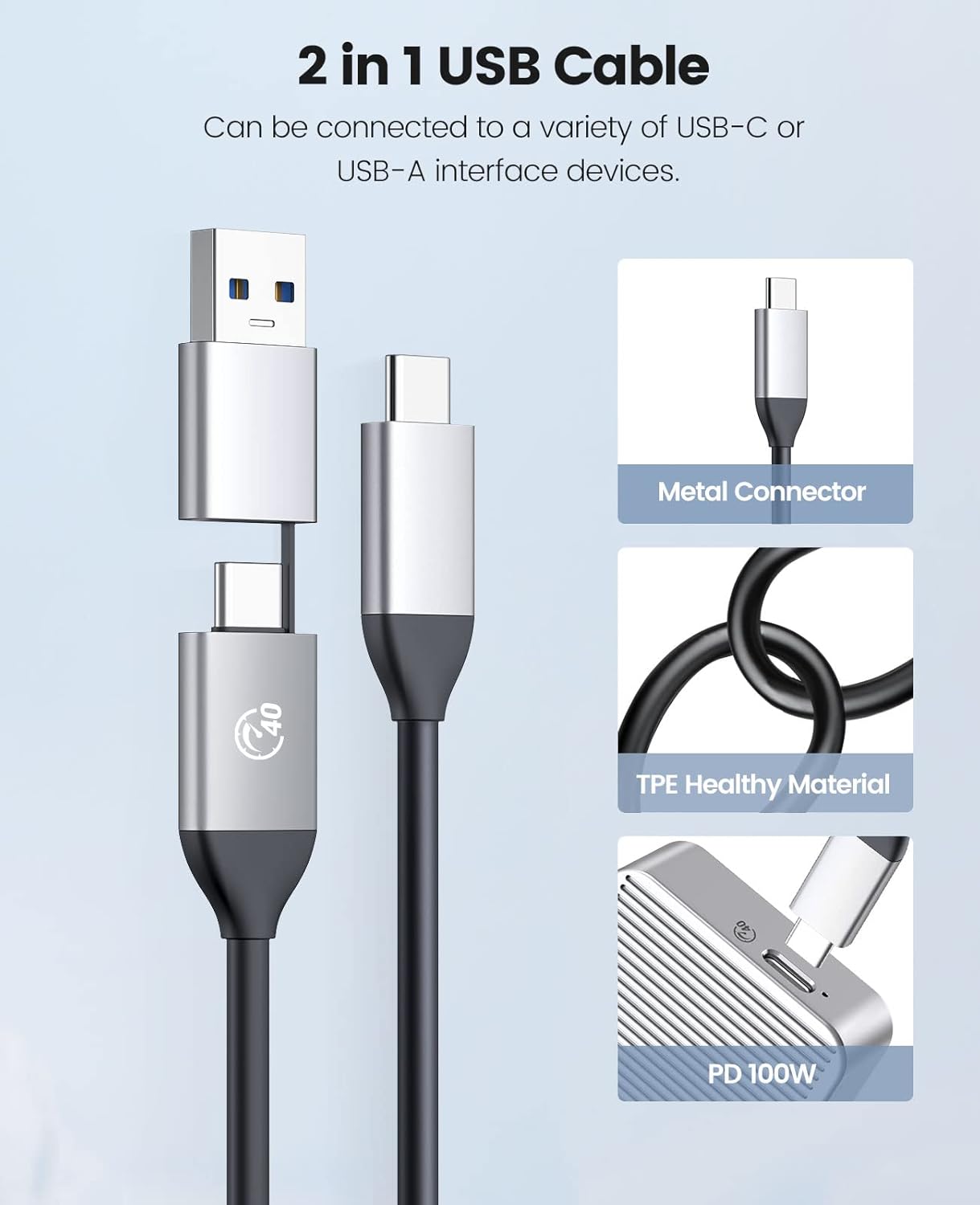 USB -кабель, що постачається з адаптером M.2, оснащений 2 вихідними портами, USB C на A (10 ГБ/с) та USB C на C (40 ГБ/с). Використовуйте високоякісний кабель передачі даних від TPE, інтерфейсу алюмінієвого сплаву та підтримує швидку зарядку PD100 W