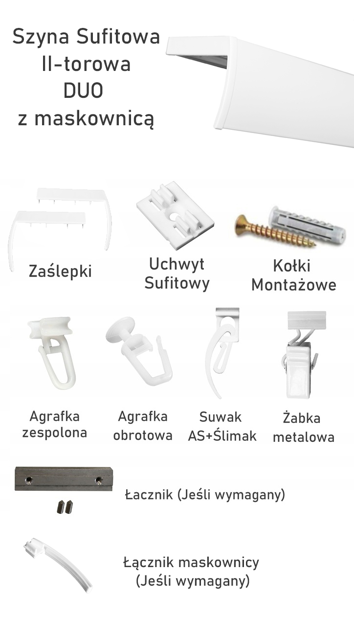 📦 Набір містить БЕЗКОШТОВНО Ми включаємо відповідну кількість з’єднувачів для всіх замовлених рейок довжиною понад 200 см (стосується звичайного кур’єрського варіанту або опція Allegro Smart). Завдяки цьому ви можете бути впевнені, що ваш карниз буде стабільним і правильно з’єднаним