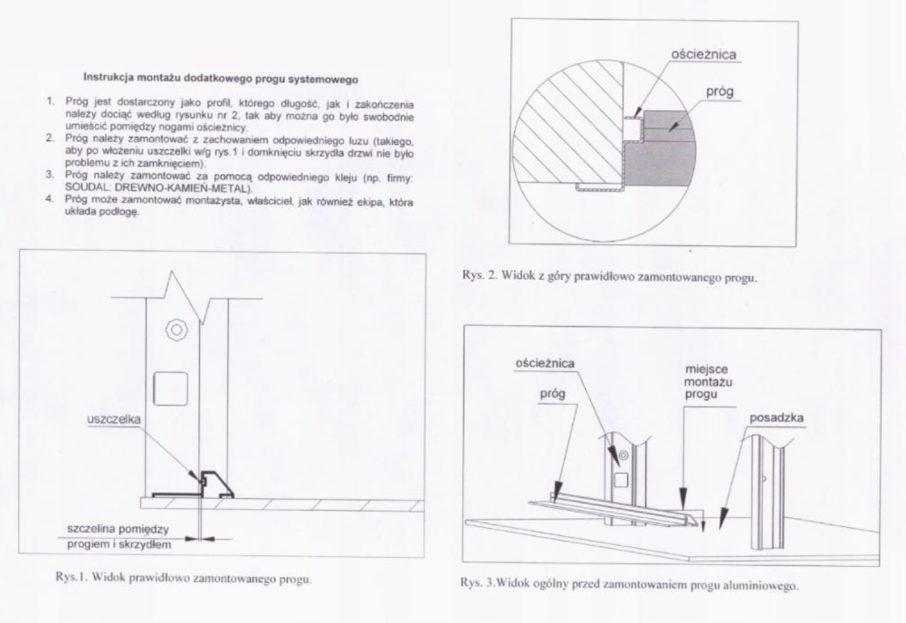 Інноваційне гумове ущільнення з покращений коефіцієнт синтетичного каучуку та використання зміненої висоти прокладки, що покращує установку в розетку та запобігає автоматичному розриву прокладки. Алюмінієвий поріг призначений для самостійного врізання за рахунок ширини між бічними профілями дверної коробки. Встановлення порогу за допомогою гнучкого, нейтрального монтажного клею для кераміки/каміню/дерева. Установка ущільнювача за допомогою засобу для миття посуду (полегшує вдавлювання ущільнювача дверей в алюмінієвий профіль порога.