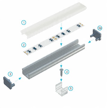 Схема монтажу елементів системи освітлення з використанням профілю А та (1) абажура BASIC, (2) світлодіодної стрічки, (3) ковпачка з отвором, (3а) ковпачка без отвору, (4) кріпильного гвинта, (4) (5) монтажний кронштейн І MINI