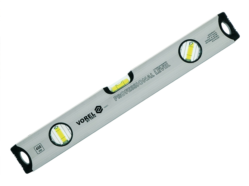 Рівень з анодованого алюмінієвого профілю. Він має три рівні, що вказують на вертикальний, горизонтальний і кут 45 градусів. Торці рівня оснащені спеціальними ударопоглинаючими бамперами. Рівні з небиткого матеріалу.