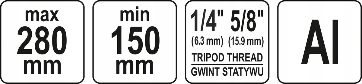 Алюмінієвий штатив. Максимальна висота 280 мм, мінімальна 150 мм. Ніжки з 1 висувним сегментом, обробленими гумовими ніжками. Розширення головки з кривошипом становить приблизно 70 мм. Фіксація за допомогою гвинта. Кріплення - різьбовий штифт 5/8" і перехідник 1/4". Нейлоновий чохол.