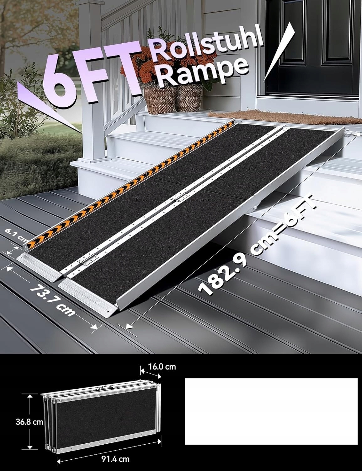 - 【Складна рампа】 надлегкий алюмінієвий пандус (розміри в розкладеному стані: 182,9 см Д × 73,7 см Ш × 5 см В; у складеному вигляді: 91,4 см Д × 36,8 см Ш × 16 см В) поєднує мобільність із вантажопідйомністю 362 кг. Ідеально підходить як рампа для інвалідних колясок для домашнього використання або вантажна рампа для транспортних засобів. Стійкий до атмосферних впливів, для використання на відкритому повітрі як пандус для бордюрів.
