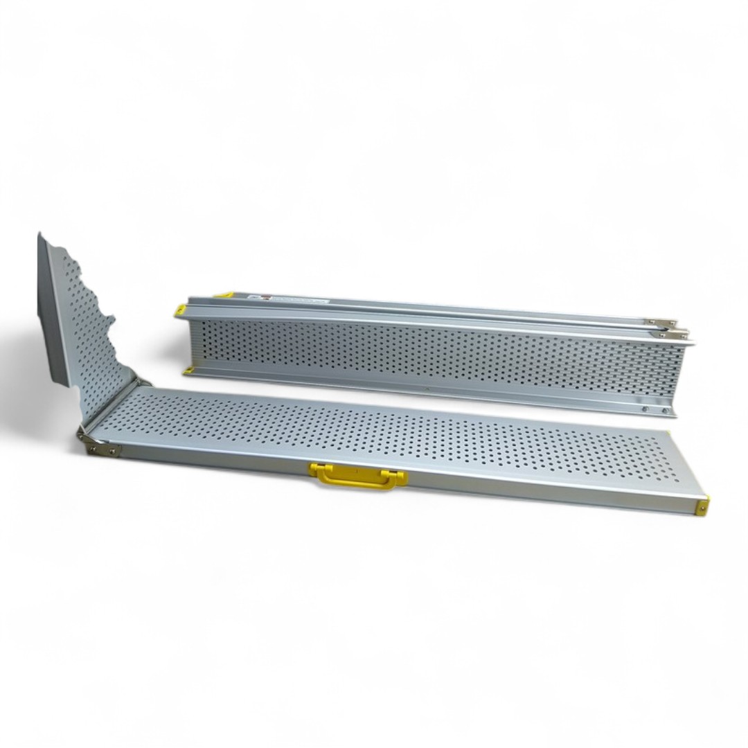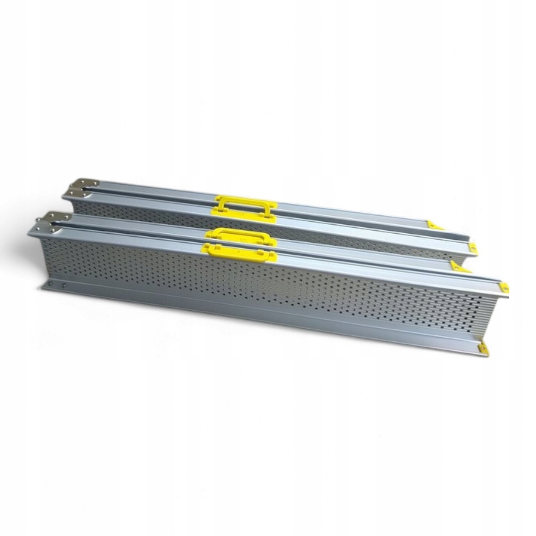 - Розміри після складання (на пандусі) 122 см х 22,5 см х 12 см. Розміри після розгортання (до пандусу) 240 см х 22,5 см х 6 см. Вага (для рампи) 7 кг. Максимальна ємність навантаження: 270 кг (для пандусу: 135 кг, без точки навантаження). Матеріал: Алюміній