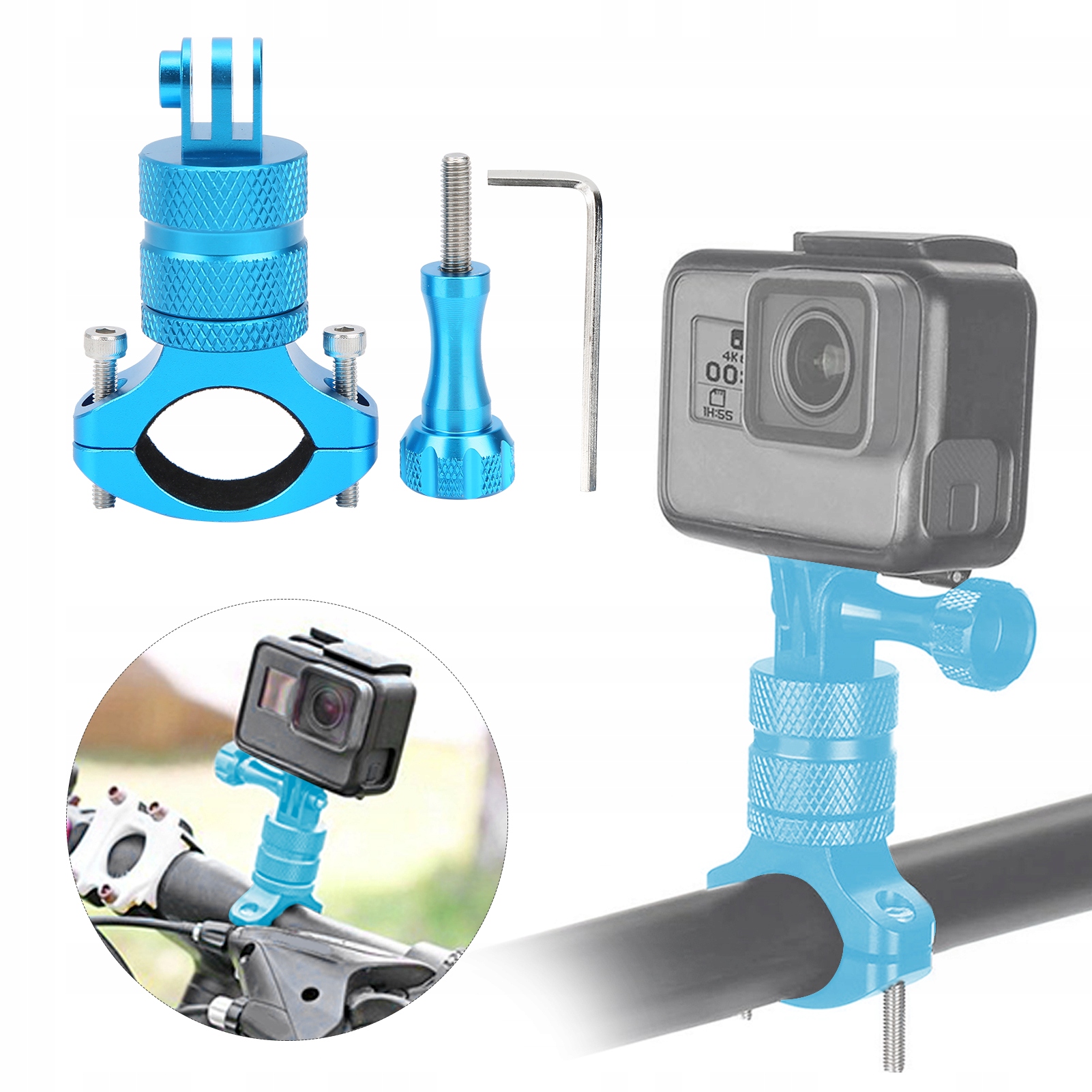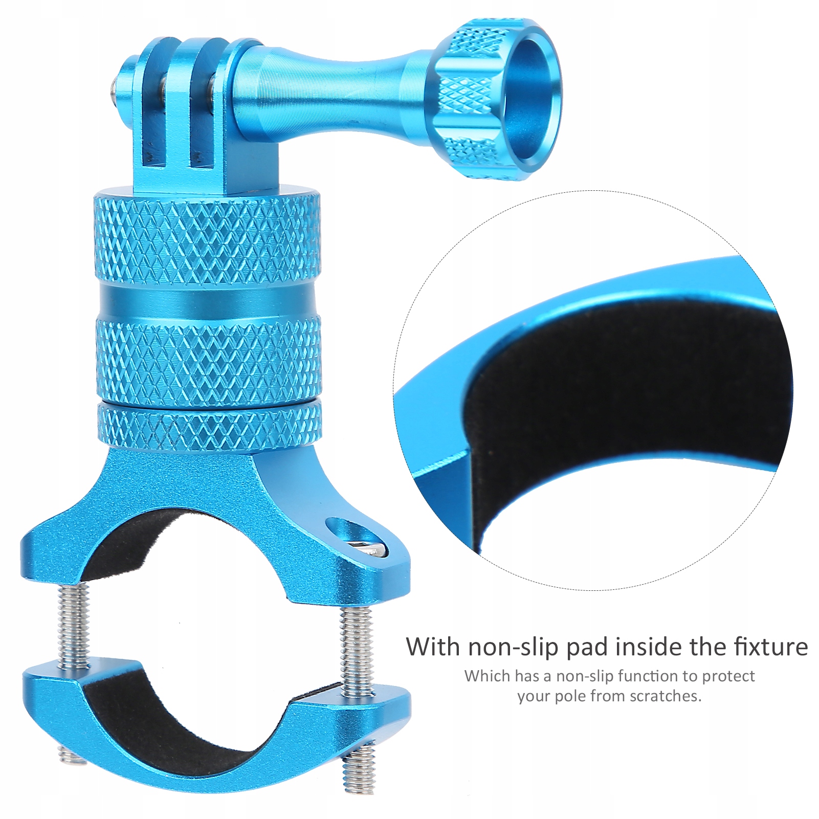 1. Кронштейн камери мотоцикла виготовлений з високого жорсткого алюмінієвого сплаву, міцного та довговічного. З нешкільним прокладком всередині зв'язування, яка має функцію анти -слизу, яка захищає пост від подряпин. Власник рульового колеса, що обертається, може обертатись на 360 градусів під різними кутами, щоб задовольнити загальні вимоги до стрільби. Сідло керма може бути встановлено на будь -якій круглої або напівкруглої труби діаметром 20–35 мм. Універсальна ручка сумісна з більшістю спортивних камер.