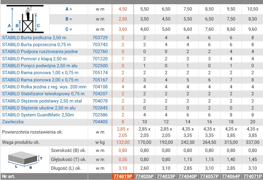 - Універсальні алюмінієві мобільні риштування для робіт здійснюється на висоті макс. до 14,40 м (з довжиною робочого поля від 2,00 м до 12,50 м)